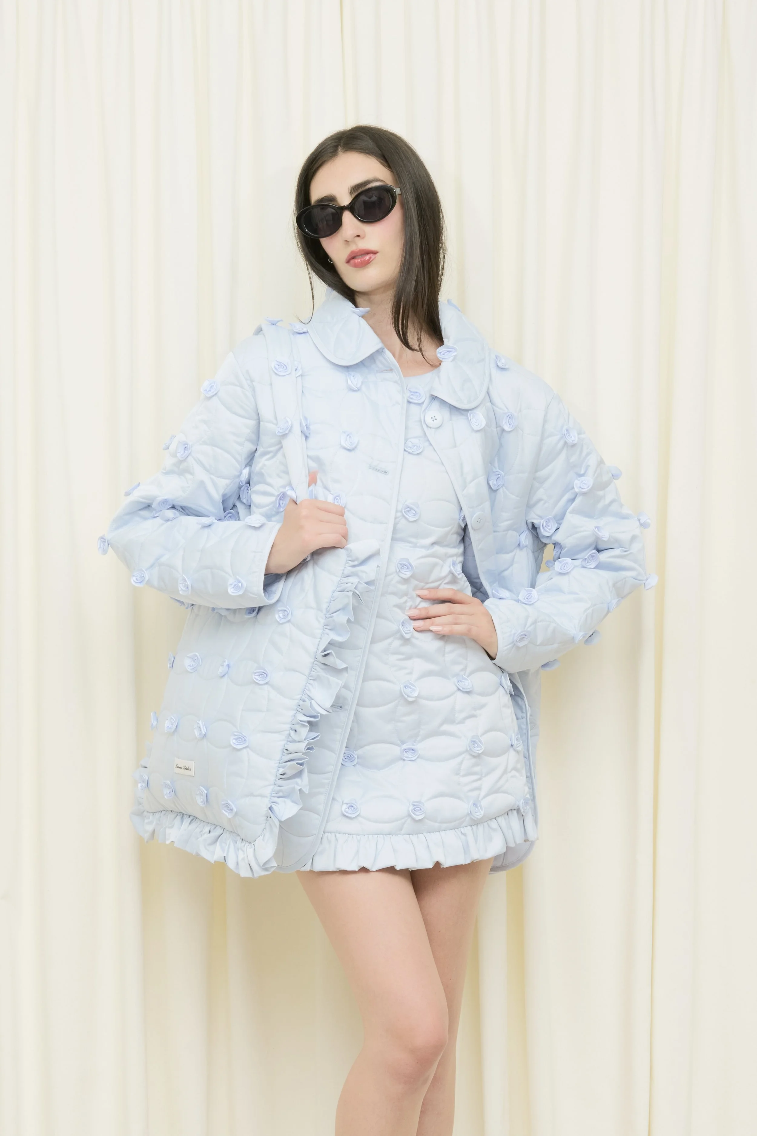 A limited edition gown inspired by an “Artist’s Dilemma”. Designed as if the maker could not decide which options to choose. Features many asymmetrical choices such as a partially exposed tulle petticoat , a large bow on the back, and unfinished ruffles trailing along the hem and bodice. Strapless bustier bodice, zipper closure up the back.
