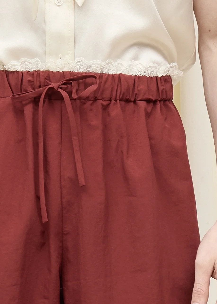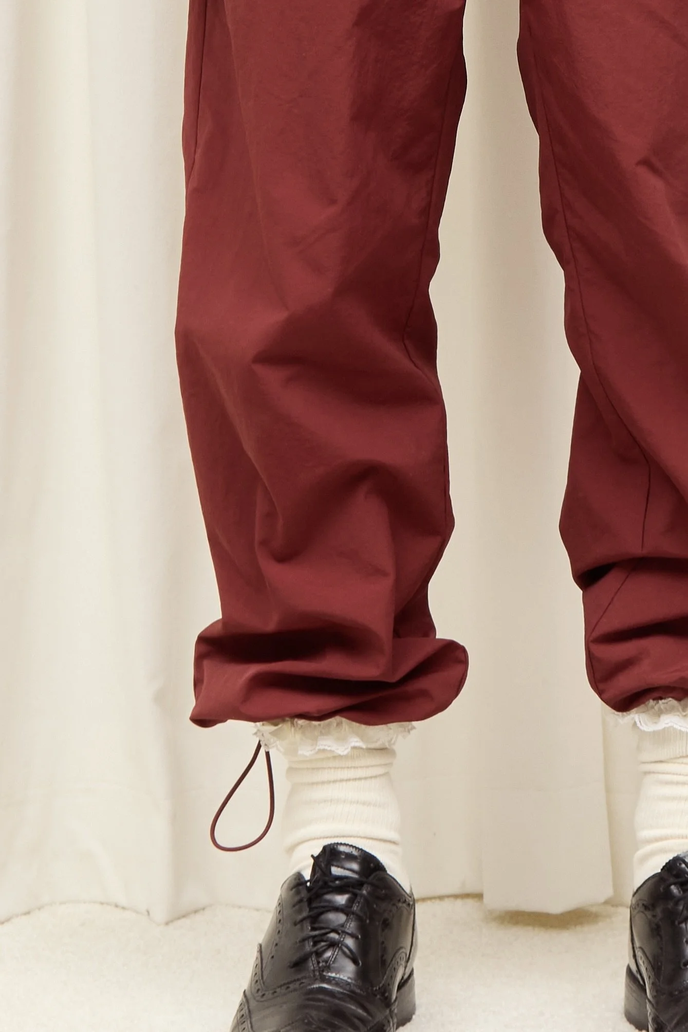 A retro inspired track pant in black nylon featuring Tanner Fletcher signature lace trim around the elastic and drawstring waistband. Draw chords around each ankle. Lined in nylon.