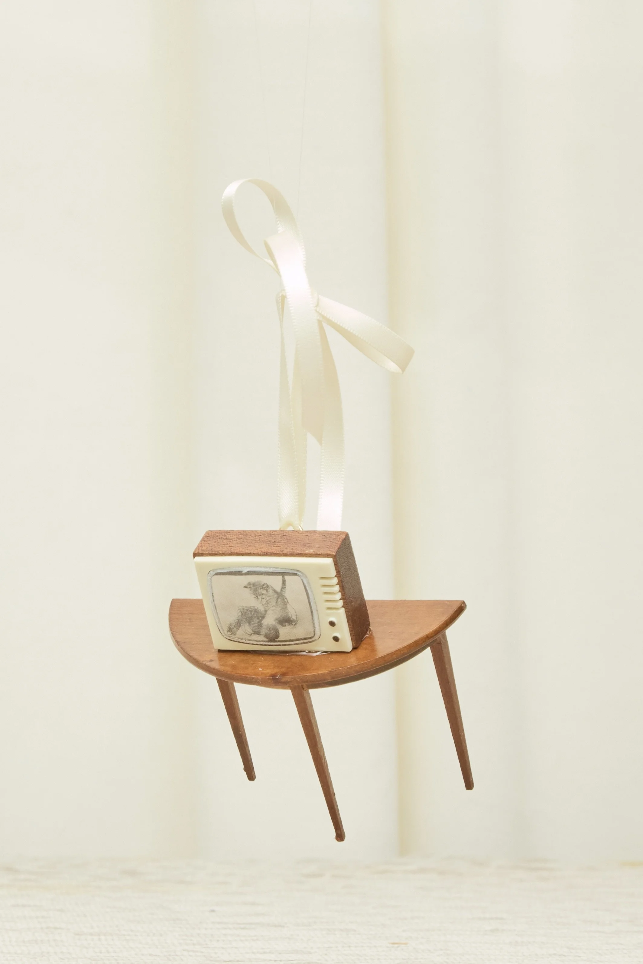 An ornate handmade ornament from a past era. A satin ribbon has been added to trim the tree!